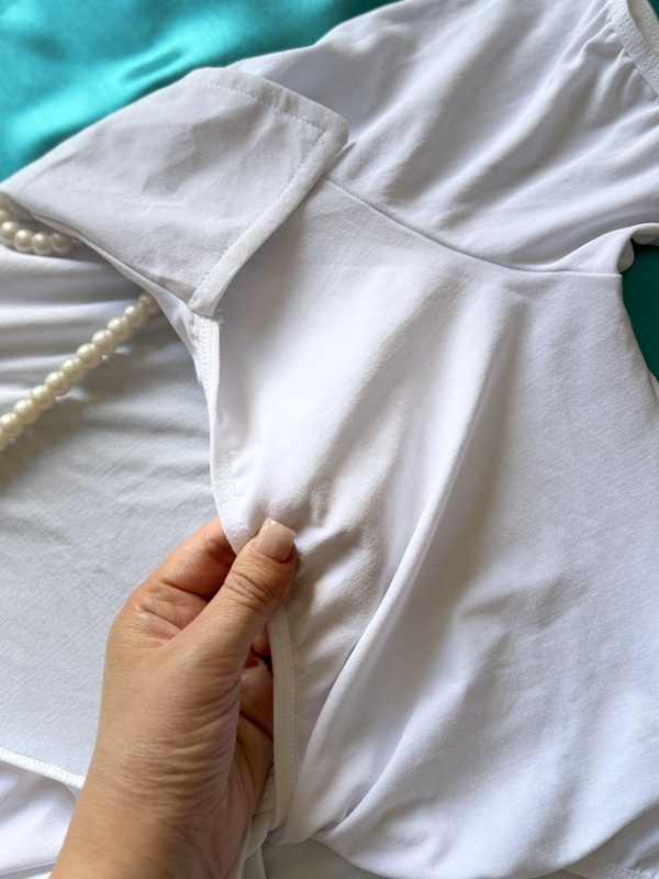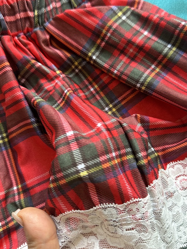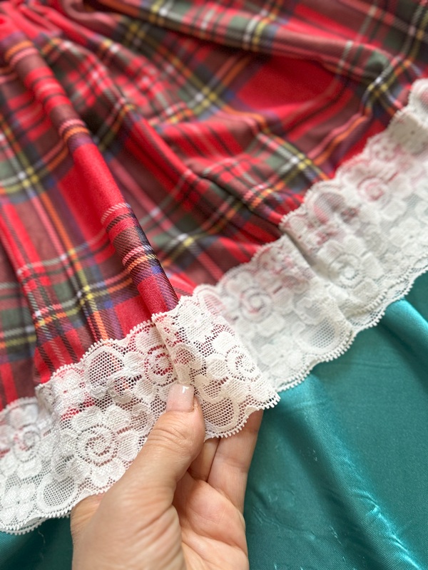 ● رنگ‌ها: نیم‌تنه سفید ساده + دامن قرمز چهارخانه با تور سفید