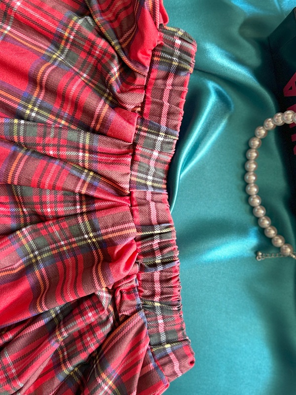 ● تعداد تکه‌ها: دو‌تکه شامل نیم‌تنه سفید گره‌ای و دامن کوتاه چهارخانه اسکاتلندی