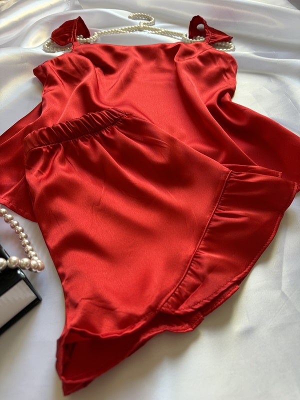لباس خواب ساتن زنانه | تاپ و شورتک مشکی و قرمز