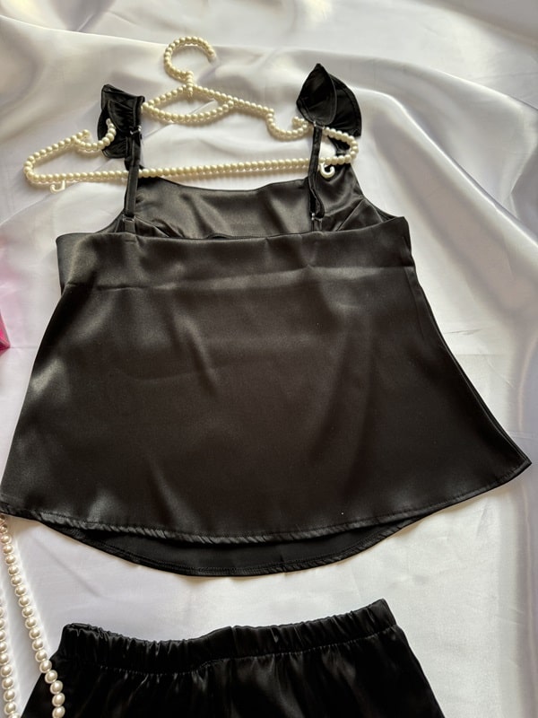 لباس خواب ساتن زنانه مشکی، ست تاپ و شورتک، جنس ساتن لطیف، بند سرشانه قابل تنظیم، مناسب سایز ۳۶ تا ۴۲